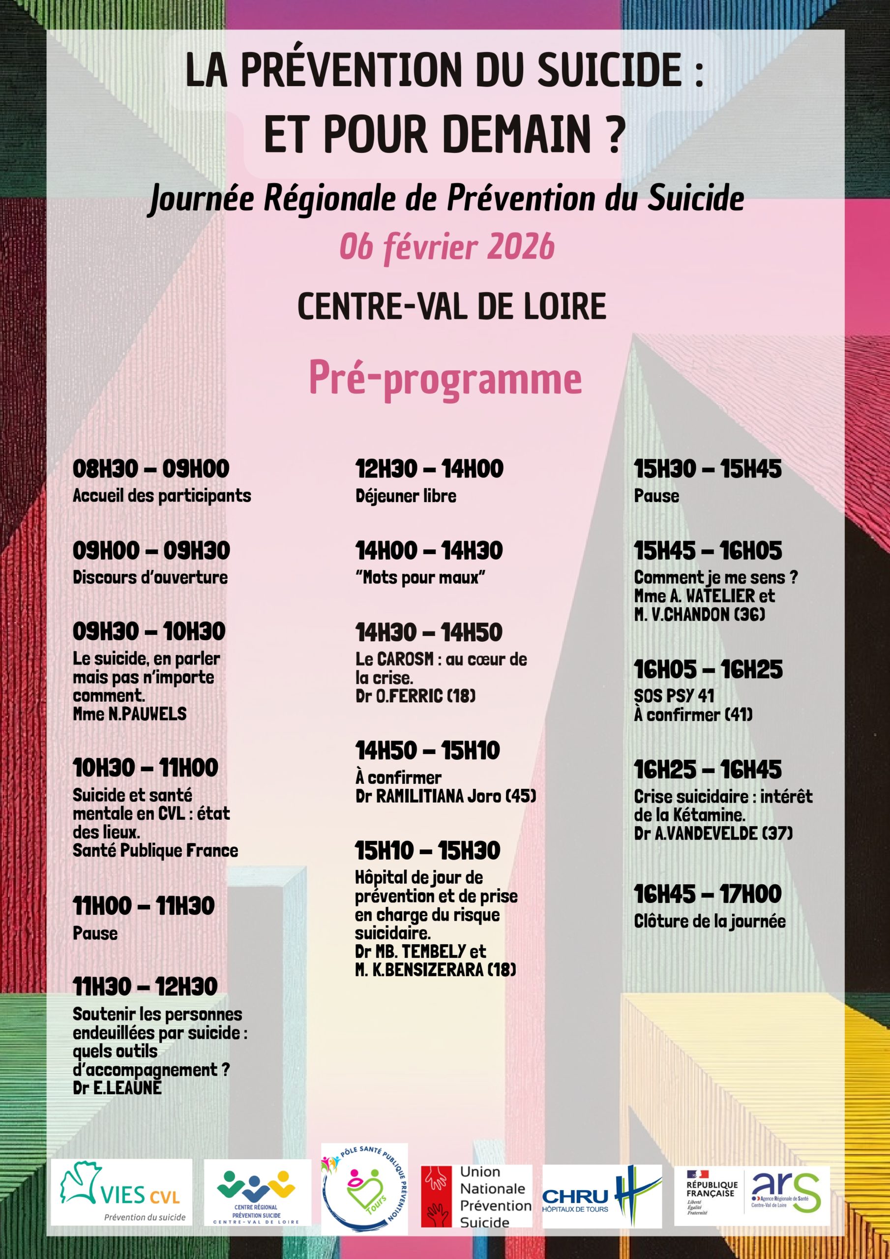 À la faculté de Droit, 50 avenue Jean Portalis, 37200 TOURS. En présentiel ou en distanciel.Durant cette journée, un plateau d’orateurs nationaux et régionaux sera présent.Professionnel(le)s de santé, médico social, social, associations, ou toute personne intéressée par la prévention du suicide : cette journée est ouverte à tous !Objectifs de la journée :- Favoriser le partage de connaissances et de pratiques,