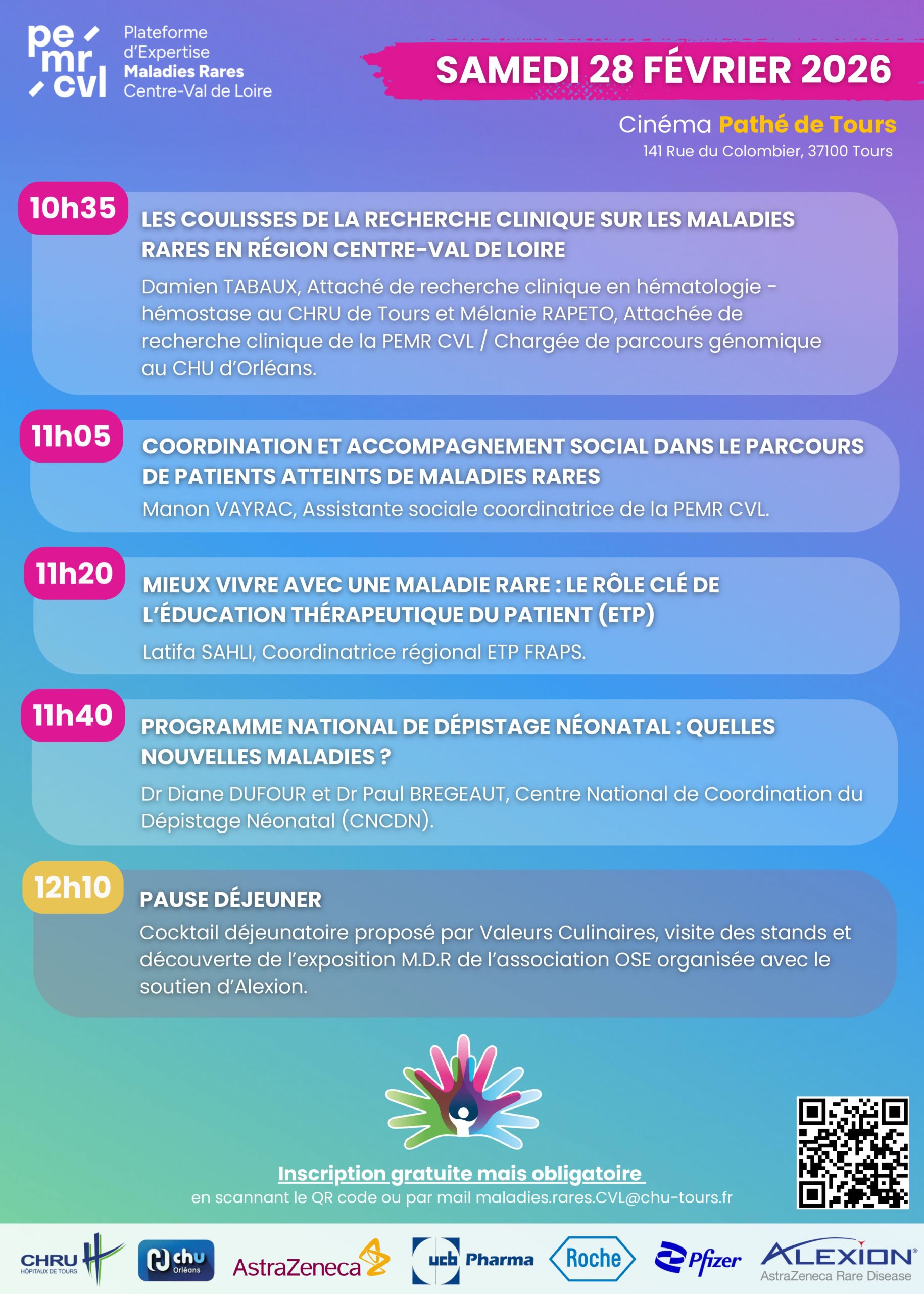 Cinéma Pathé de Tours – 141 rue du Colombier, 37100 ToursCette rencontre, ouverte au grand public, sera un temps privilégié pour mieux comprendre les enjeux des maladies rares et favoriser le dialogue entre tous les acteurs concernés.
