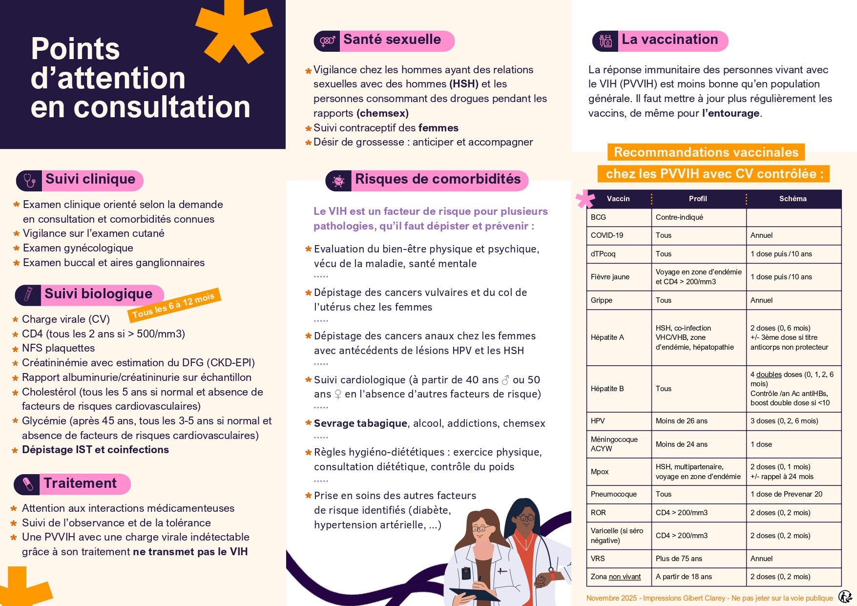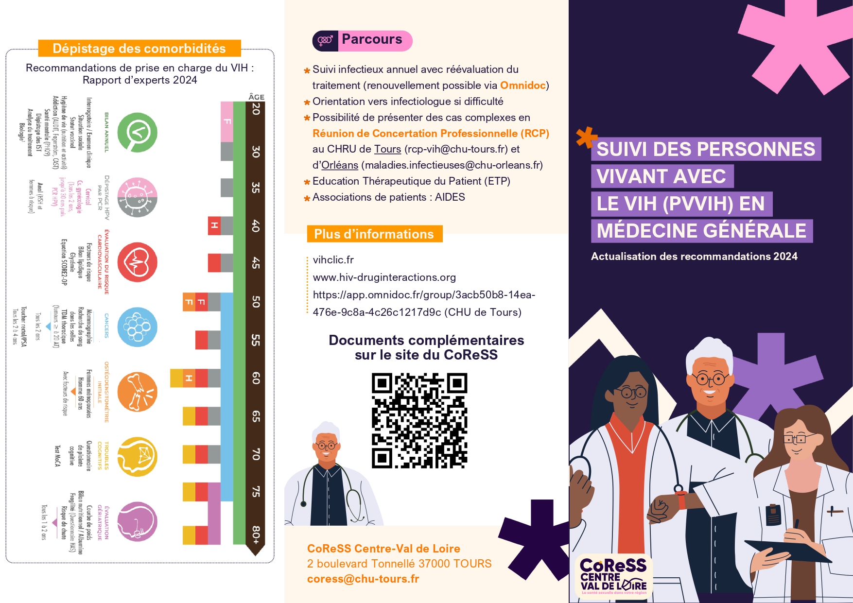 2. Plaquette suivi des PVVIH en médecine généraleCette plaquette est destinée aux professionnel·les de santé prenant en charge les personnes vivant avec le VIH (PVVIH) en médecine de ville. Elle reprend de manière synthétique, les éléments clés du suivi : clinique, biologique, traitements, santé sexuelle, comorbidités, vaccination, ainsi que les ressources disponibles en Centre-Val de Loire.La plaquette est disponible en PDF (pièce-jointe), sur le site du CoReSS (www.coress-cvl.fr/prise-en-charge-des-pvvih) et commandable au format papier.