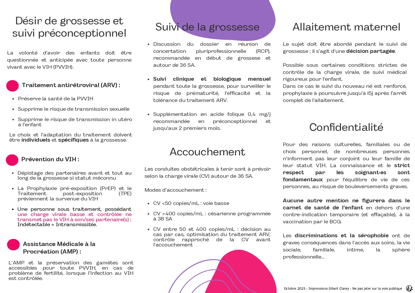 1. Plaquette Grossesse et VIHDestinée aux professionnel·les prenant en charge les femmes vivant avec le VIH, cette plaquette présente les repères essentiels du suivi de la grossesse : préconceptionnel, grossesse, accouchement, confidentialité, allaitement, post-accouchement, ainsi qu’un encart sur les ressources et acteur·rices disponibles en Centre-Val de Loire.La plaquette est disponible en PDF (pièce-jointe), sur le site du CoReSS (www.coress-cvl.fr/femmes-et-vih) et commandable au format papier.