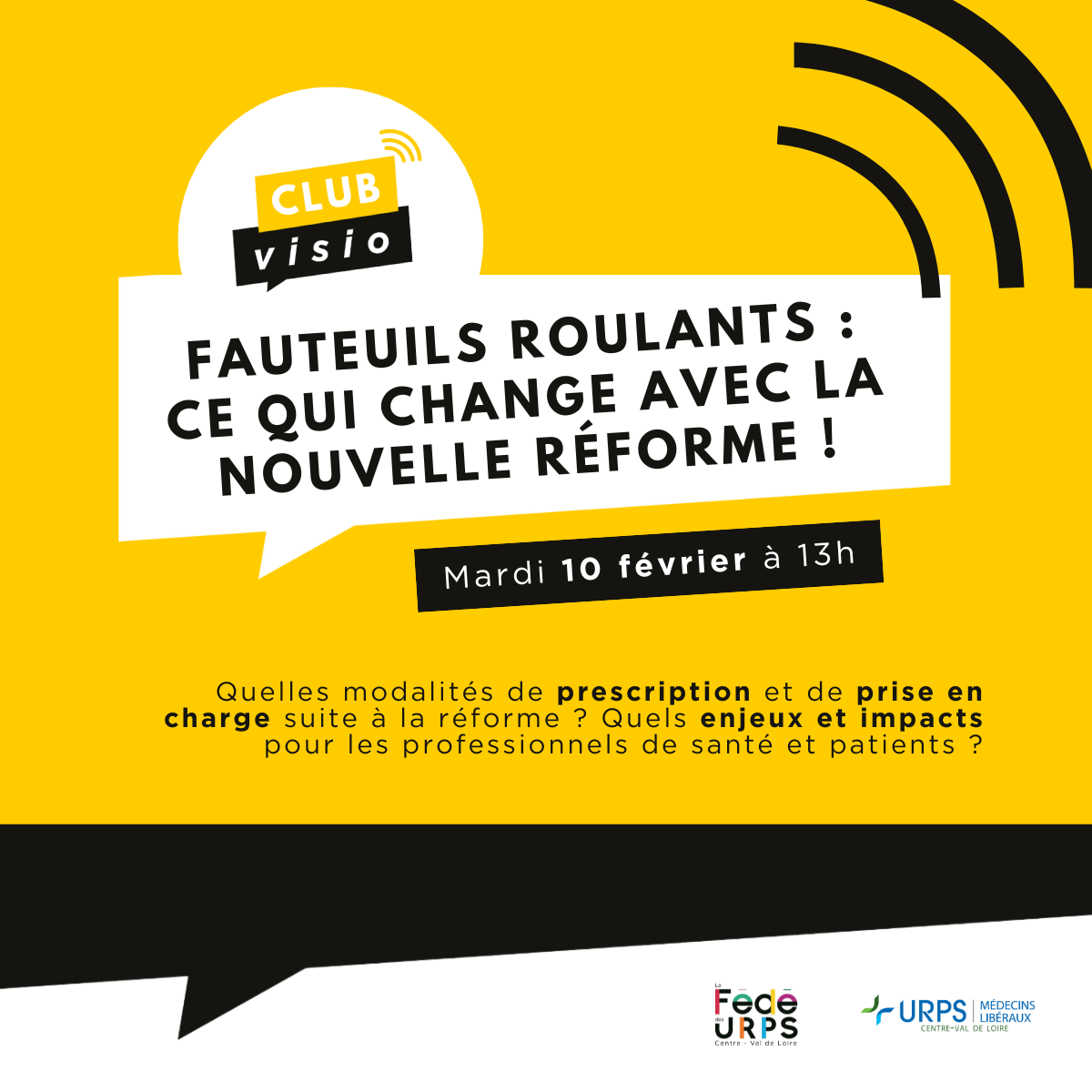Club Visio « Fauteuils roulants : ce qui change avec la nouvelle réforme ! » > Mardi 10 février à 13h Publics : Médecins généralistes, médecins physique et réadaptation, kinésithérapeutes, pharmaciens et ergothérapeutes.Formulaire d’inscription : https://forms.office.com/pages/responsepage.aspx?id=epe8dAsDakOg5gqvdn8c-iA8phnRes9LpUpgtYUd7SNURUFZRjY5MTJYVk8zTDkyRVlDRzVIV1dTSS4u&route=shorturl Au programme, 30 mn de décryptage et 30 mn d’échanges :- Quelles modalités de prescription : qui peut prescrire quoi ?